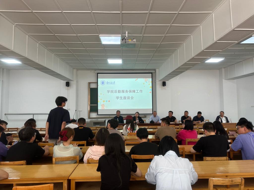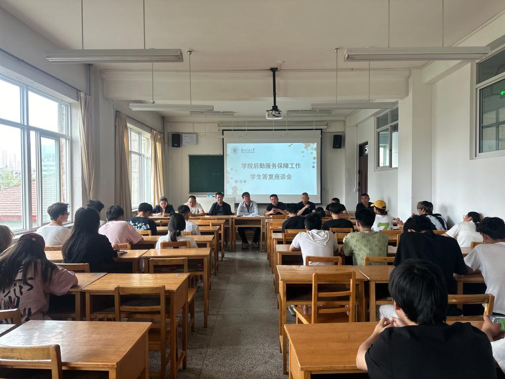 5月22日在实验楼,501召开后勤服务保障工作学生答复座谈会。学工办、维修中心、物业管理中心等部门负责人与来自各学院的30多名学生代表面对面交流,听取学生对宿舍管理、公共设施等方面的意见建议。