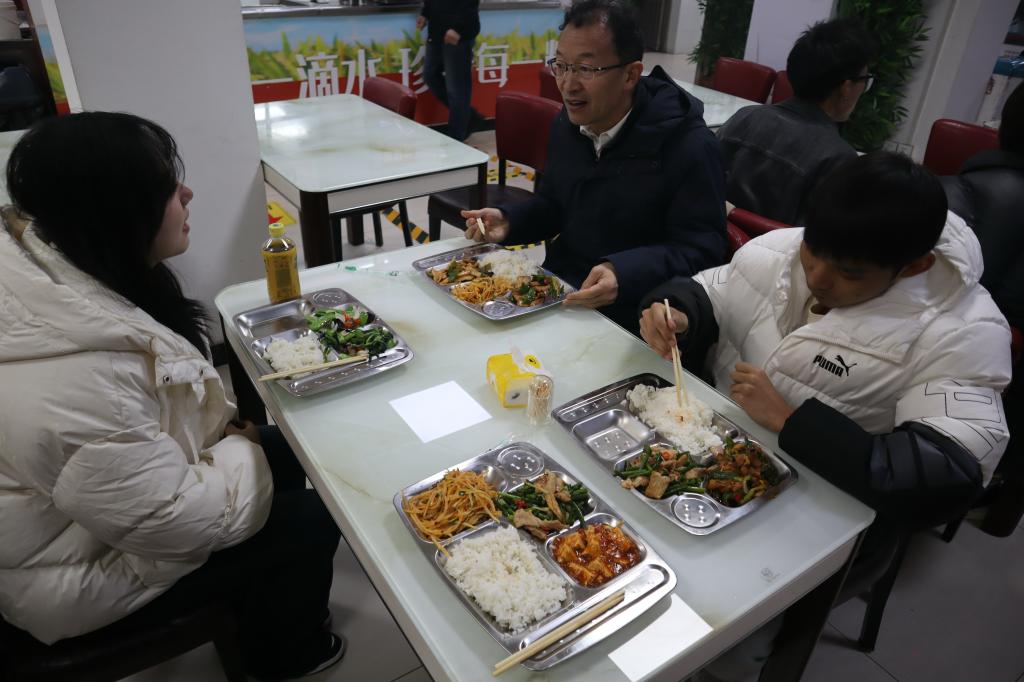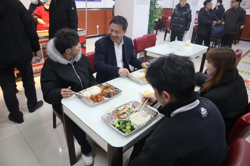 随后,校领导前往学生食堂,与同学们共进晚餐。餐桌上,大家畅谈校园生活,气氛温馨融洽。校领导认真听取学生对菜品口味、价格及服务的意见,并鼓励大家积极反馈,共同促进餐饮服务提升。