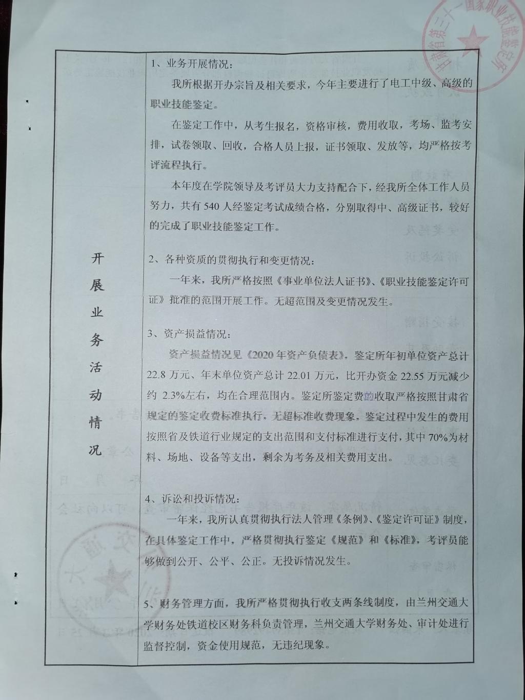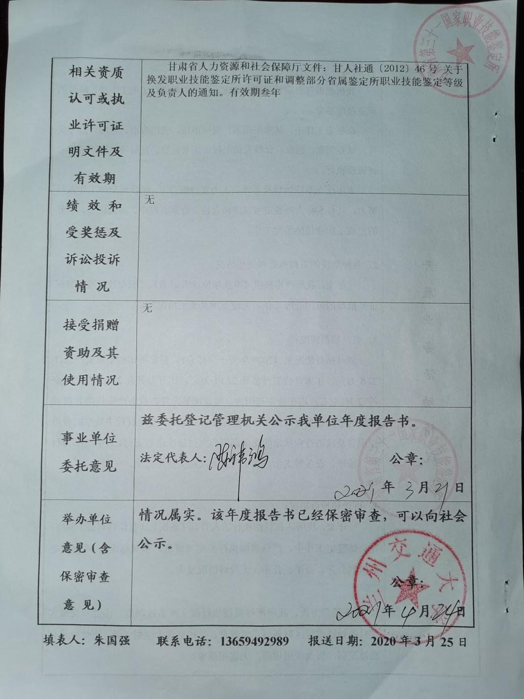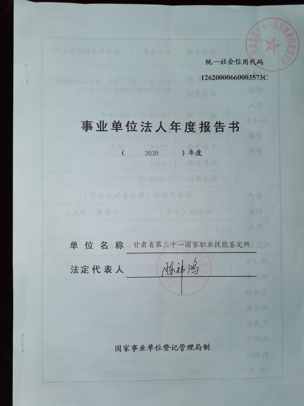甘肃省第三十一国家职业技能鉴定所《2020年事业单位法人年度报告书》