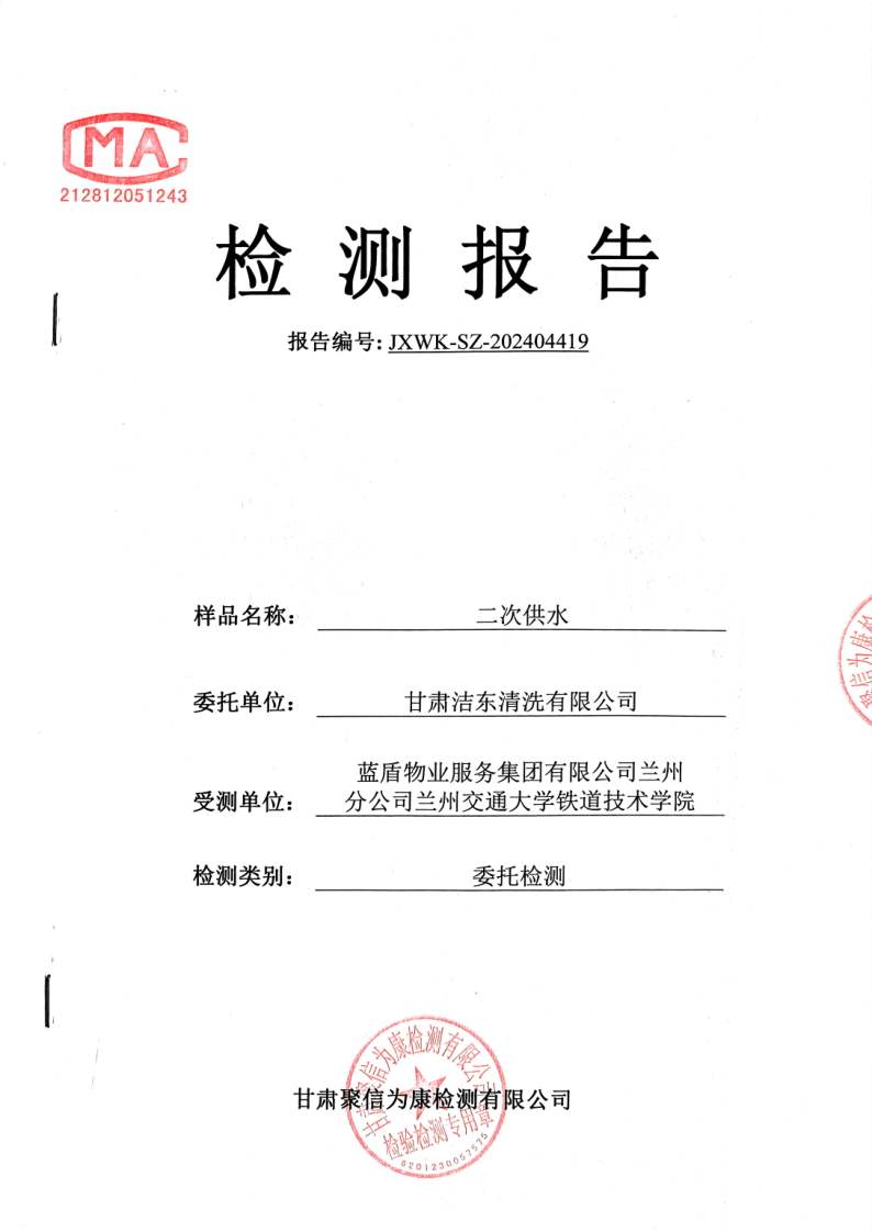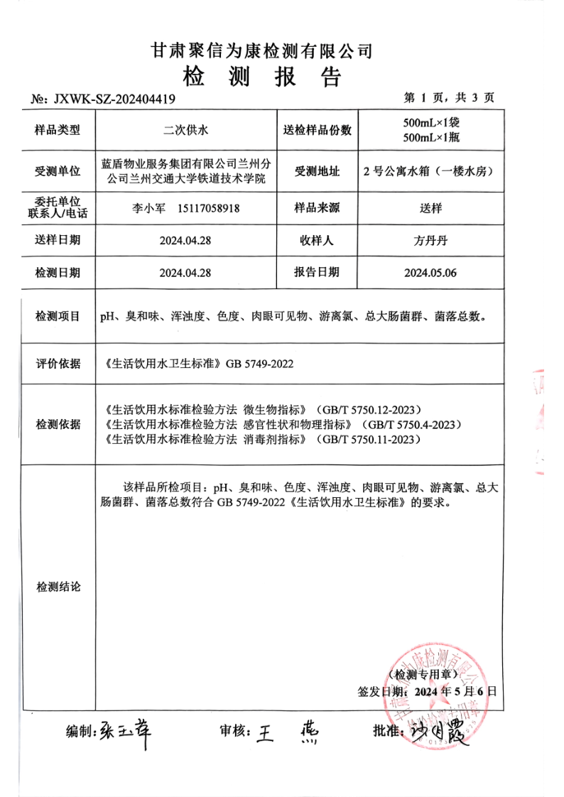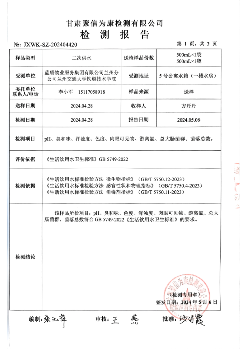 根据对二次供水设施需定期清洗消毒的规定要求,学院校园服务与餐饮中心委托甘肃洁东清洗有限公司于2024年4月28日,按照行业严格程序对学院3个二次供水水箱进行了本年度上半年的清洗消毒工作,清洗后对各水箱水质进行了抽样检验,检验结果均为“样品所检项目:PH、臭和味、色度、浑浊度、肉眼可见物、游离氯、总大肠菌群、菌落总数符合《生活饮用水卫生标准》GB5749-2022的要求”。现对相关清洗及抽样检验结果予以公示。