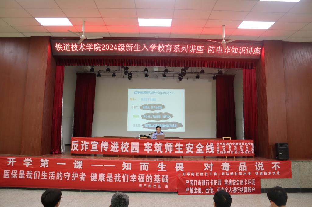 9月26日,铁道技术学院邀请团结新村天平街社区、团结新村派出所、中国电信兰州分公司在学院开展了以“学懂反诈法,做金融卫士”“全民学法,全社会反诈”、“开学第一课——知而生畏,对毒品说不”为主题的宣传教育讲座。学院领导和学工、保卫部门人员和2024级全体新生参加了讲座。