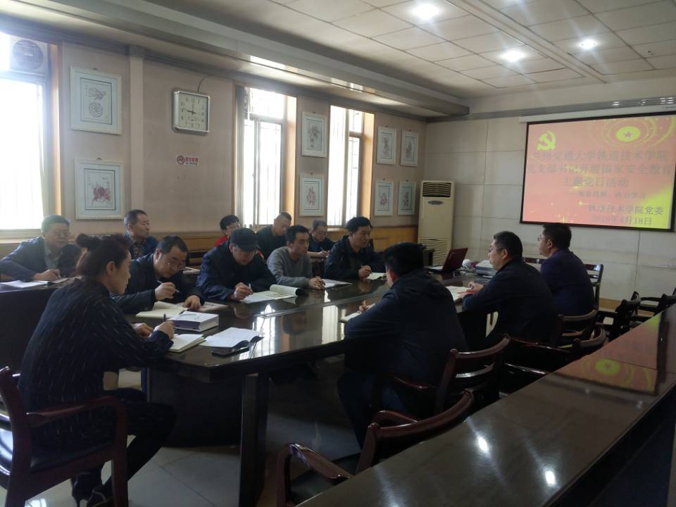 为了增强党员对国家安全教育日和《中华人民共和国国家安全法》的认识和了解,提高国家安全意识和防范意识,根据校党委组织部《关于开展国家安全教育支部主题党日活动的通知》,铁道技术学院于4月18日下午14:30开展了国家安全教育主题党日活动,院党委书记朱文贤、副书记、副院长刘锋、党委组织员李小菊以及学院全体支部书记参加了活动。