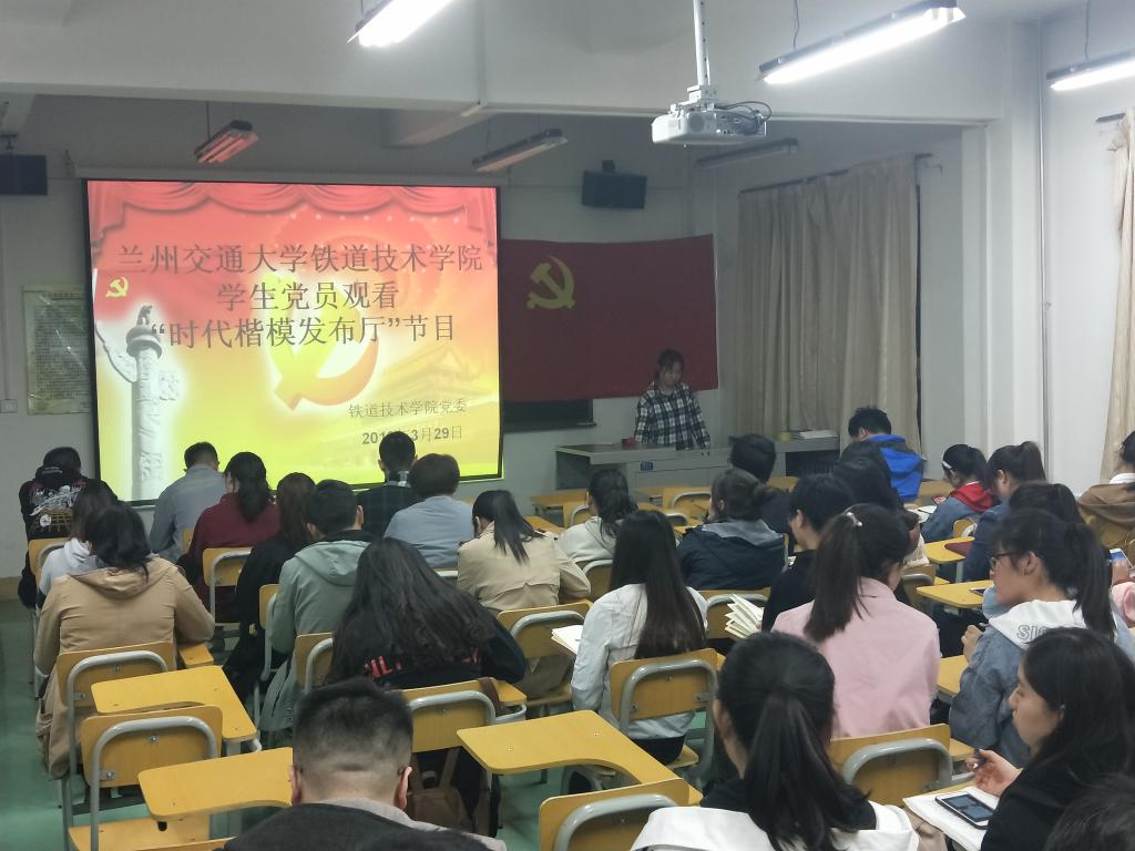根据校党委宣传部部署,铁道技术学院党委要求教工党员自行收看直播,组织全体学生党员于2019年3月29日21:00在机车实训中心二楼西实验室观看由中央电视台综合频道播出的“时代楷模发布厅”节目——古浪县八步沙林场“六老汉”三代人治沙造林先进事迹。