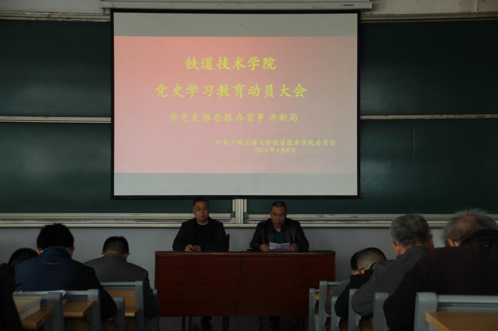 为深入贯彻落实习近平总书记在党史学习教育动员大会上的重要讲话精神及校党委《关于开展党史学习教育的实施方案的通知》要求, 4月8日,铁道技术学院召开了党史学习教育动员大会。学院党委书记朱文贤、院长陈祎鸿、学院党委委员、全体党员参加了会议,会议由陈祎鸿院长主持。